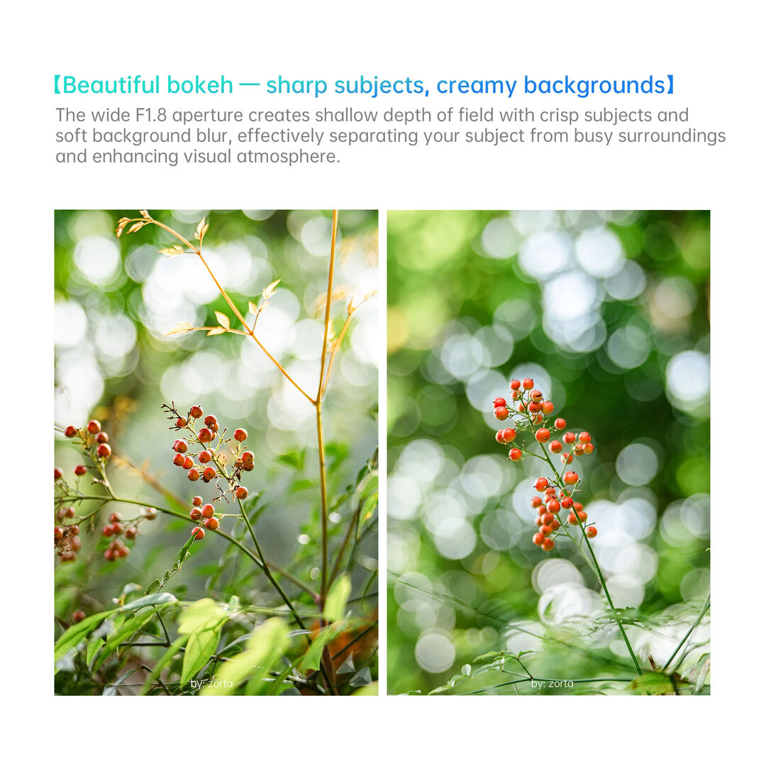 - f/1.8 maximum aperture for excellent low-light performance and shallow depth of field for subject isolation
