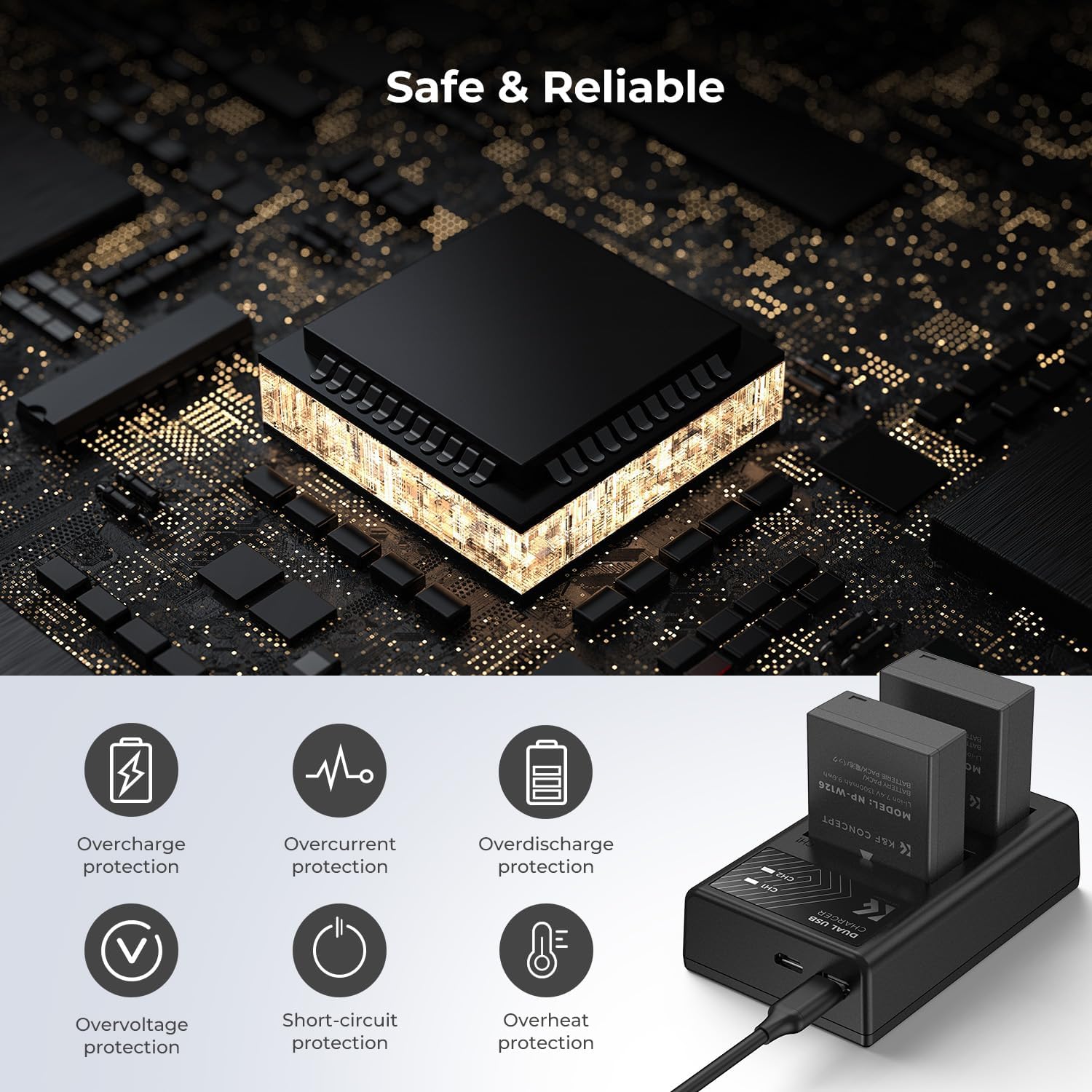 Safe and Reliable. With over-charging, over-current, over discharge, over-voltage and short-circuit protection. Besides, the plastic protective cover inside the package can better protect your battery contacts.