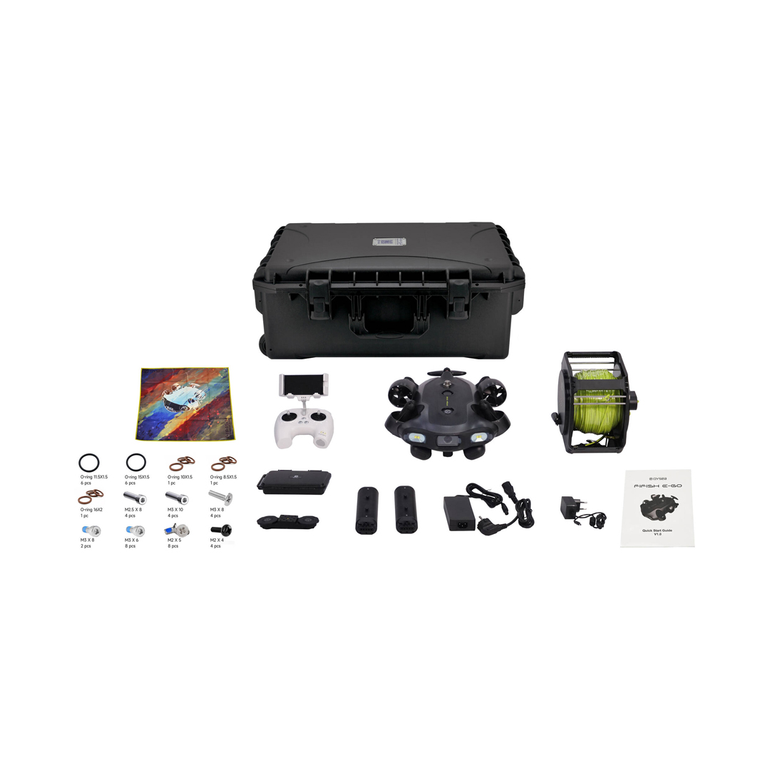 The E-GO captures up to UHD 4K30 video and 8.3MP photos in a wide 146° field of view, with a 3.9″ minimum focus distance and AI anti-haze filter. Your photos and videos can be stored to the supplied 128GB microSD card, which comes preinstalled in the ROV. The controller also supports up to a 128GB microSD card for manually transferring captured photos and videos from the ROV to the controller via the FIFISH app.