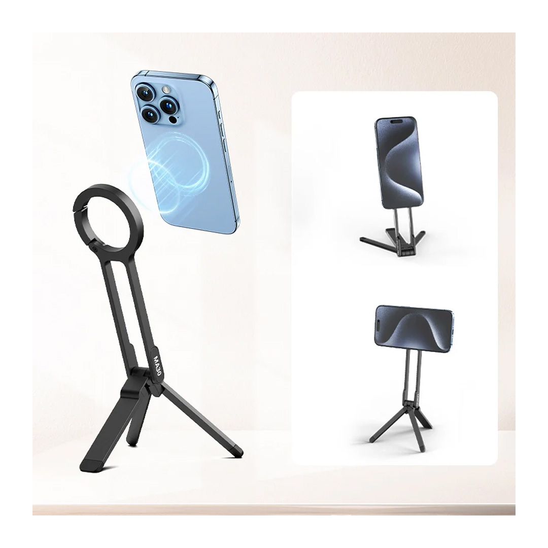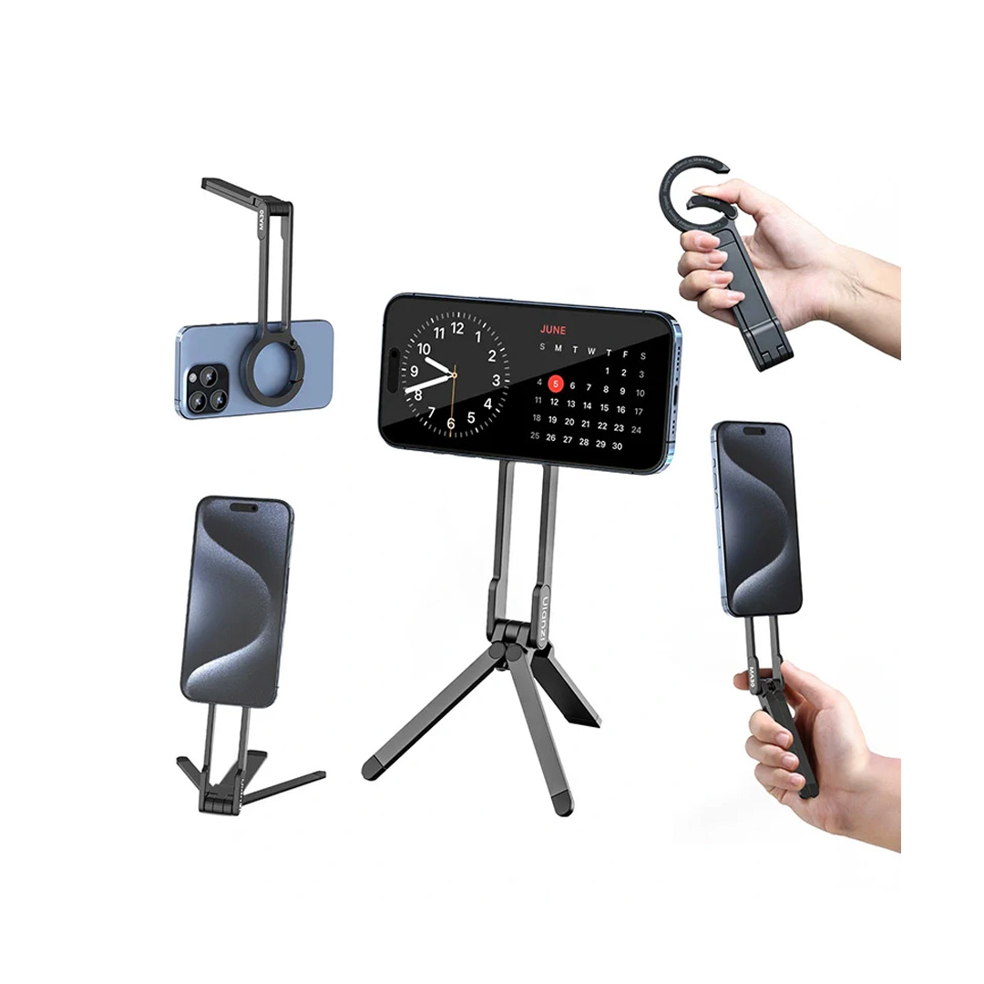 The MA30 Carabiner-Mounted MagSafe Mobile Phone Tripod from Ulzani is a convenient folding tripod and grip for MagSafe-enabled smartphones and phone cases. It has a unique carabiner-type clip design that allows it to be quickly attached to a strap or belt loop to keep handy at all times. It also has a second magnetic ring on the other side for adding accessory LED lights, filters, and more. The MA30 supports smartphones in vertical or horizontal orientation.